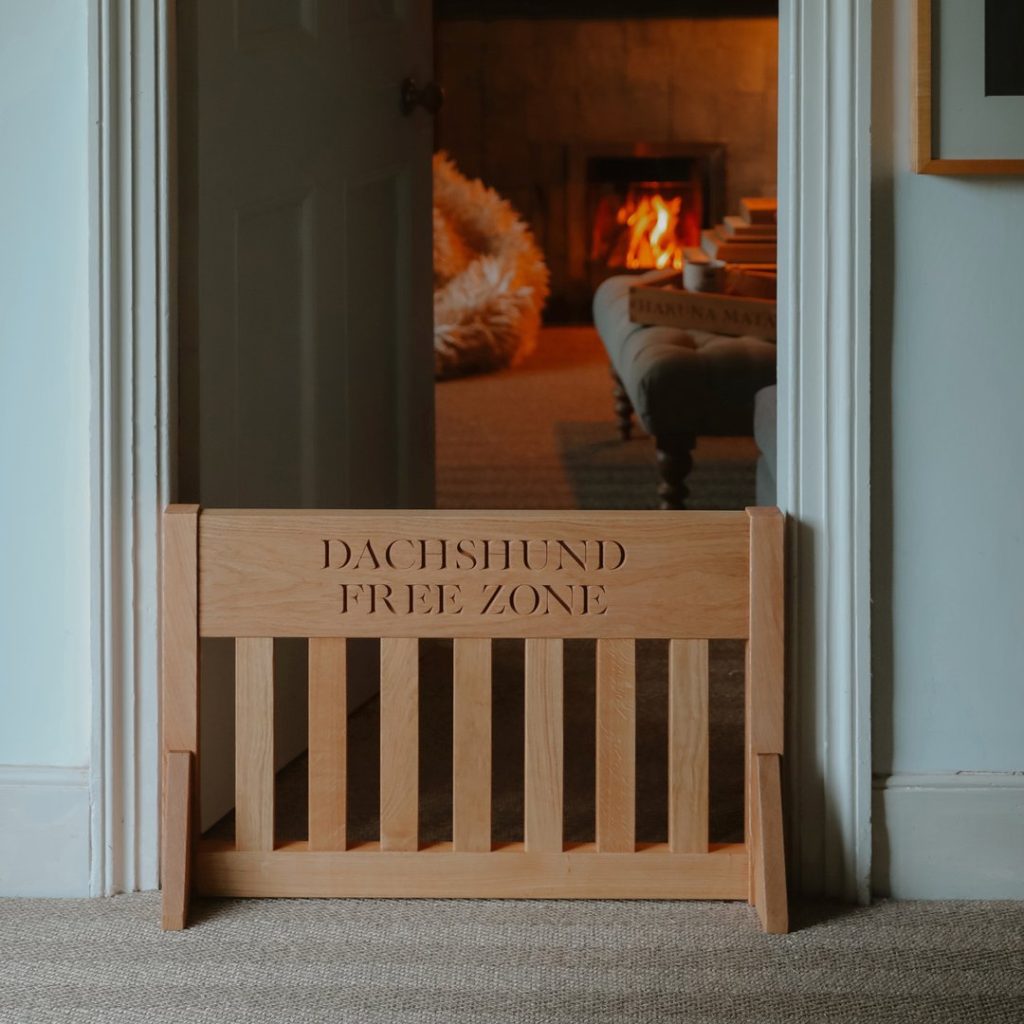 A premium personalised oak dog gate from The Stylish Dog Company. This handmade solid oak gate is a statement piece that combines function with beautiful design. Engraved with your chosen text — a luxury gift for the home that loves both style and dogs. Made to order in the UK.