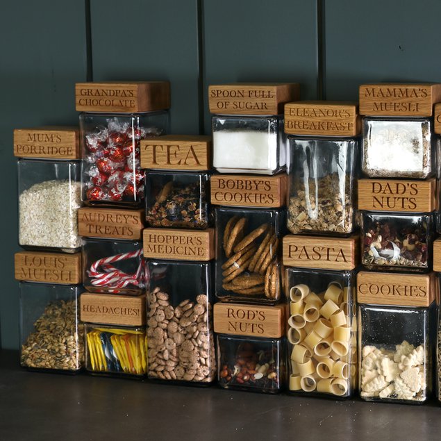 Square-shaped jars with airtight seals and beautiful wooden lids that are stackable and interchangeable. Available in small, medium, and large sizes with optional personalised engraving — a thoughtful and practical gift.