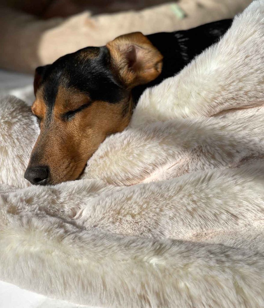 A premium blush beige frost faux fur blanket from The Stylish Dog Company. The Supreme range offers their thickest, most luxurious fur — perfect for calming anxious dogs whilst complementing neutral interiors. Handmade in the UK.